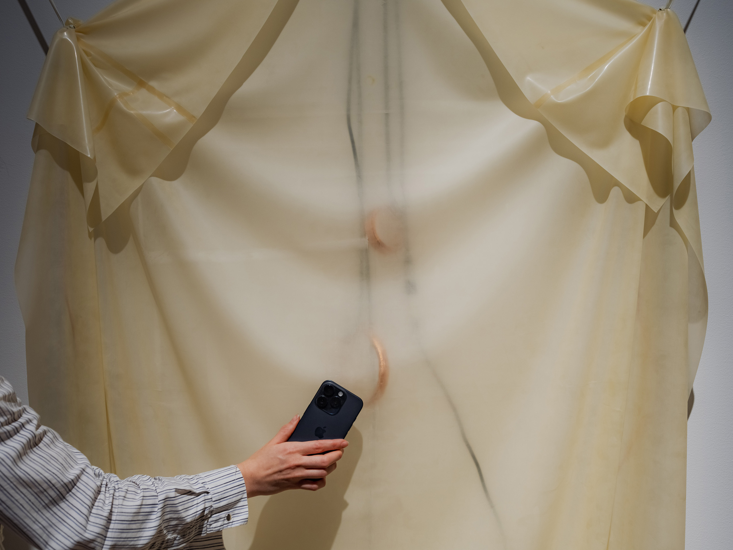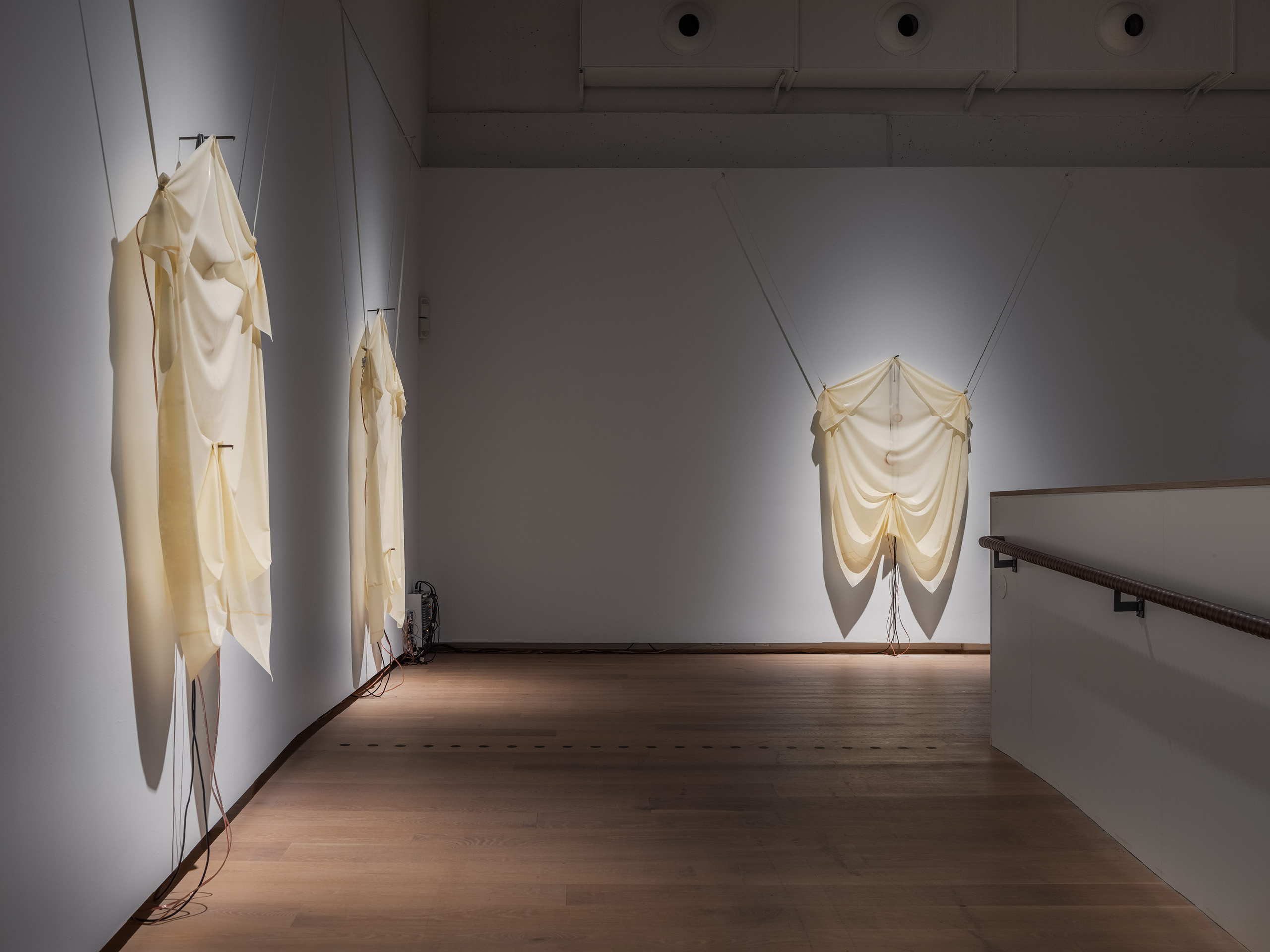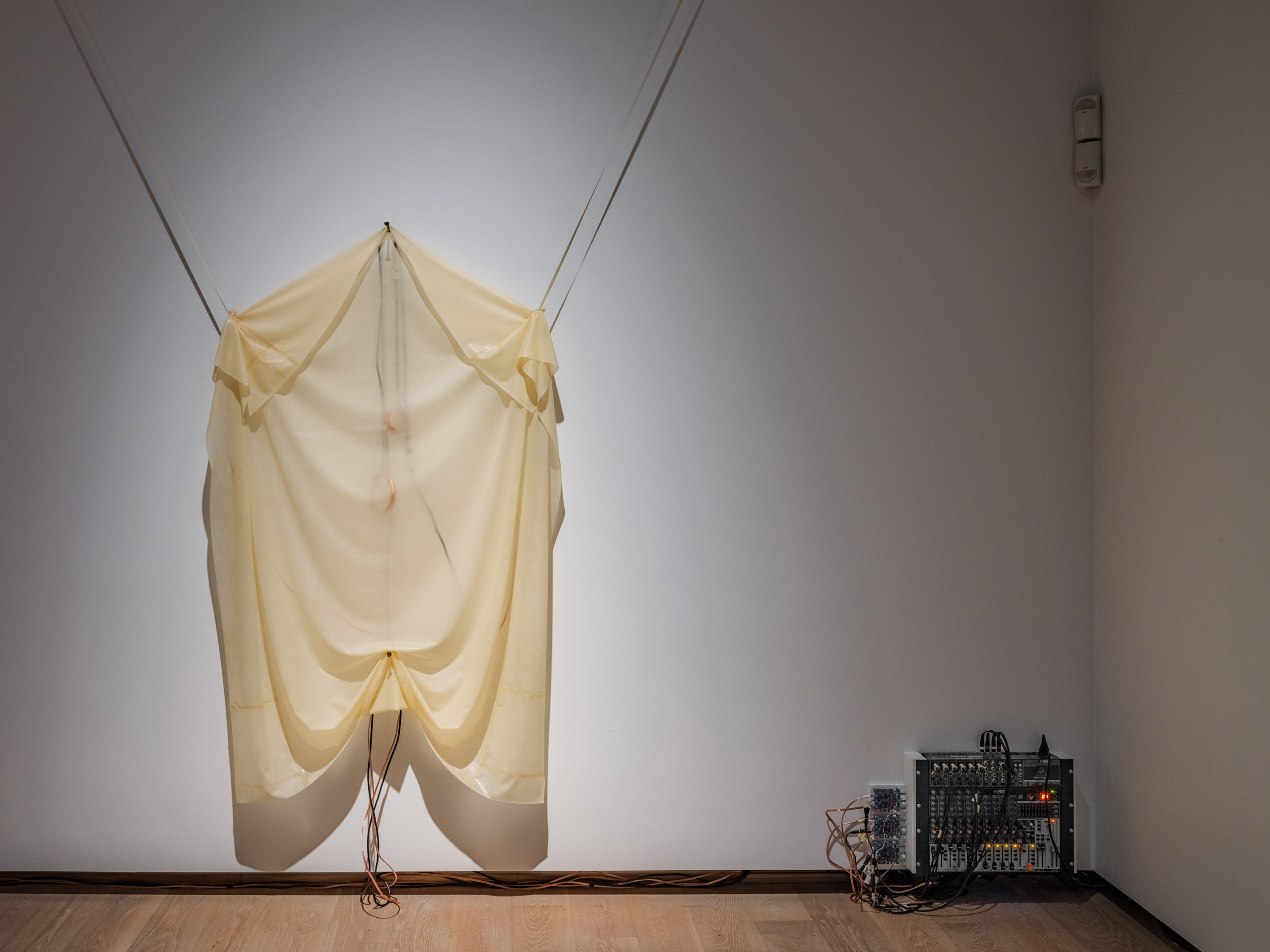 At Accelerator, Knox borrows from Francisco de Zurburan’s series of Veils of Saint Veronica (1635–1640), one of which is exhibited at the National Museum in Stockholm. Here, she reinterprets them in natural latex—made from the fluid exuded by a rubber plant upon injury, and a material prevalently used in erotic fetish-wear—to create a portrait of electromagnetic fields produced by the exhibition space and all bodies within it. Instead of a face emerging from the veil, copper coils appear, which continuously receive and emit the room’s usually inaudible electromagnetic hum. Knox connects organic traces in religious iconophilia to the digital traces of the mobile phones we carry with us, which constantly transmit and store memories, relationships, secrets and voices via radio frequencies—a type of electromagnetic radiation. Tracing the energetic exchange that occurs between architecture, artworks and visitors, Knox also nods to Accelerator’s history as a Physics laboratory.
